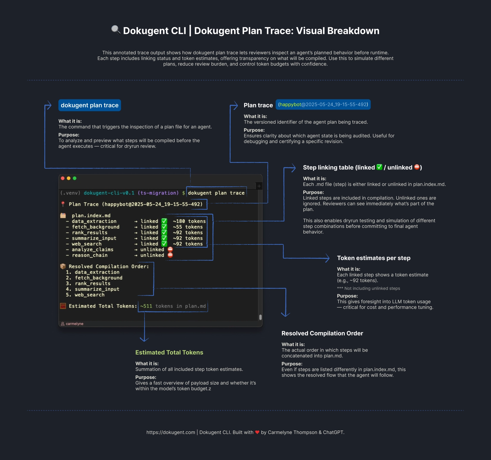 dokugent plan tracecommand is essentially a 'dry run' that gives visibility into the agent's intended behavior before execution. It categorizes each step as linked or unlinked, estimates token usage, and shows the resolved execution order — providing transparency and debugging capabilities before any tokens are consumed.”In larger agent systems, this helps developers detect planning errors, orphaned steps, or overly expensive branches before deployment. It improves clarity while lowering review cost and execution risk.